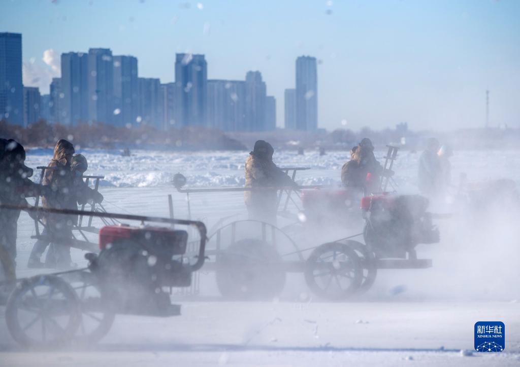 12月7日,工作人员在第四届哈尔滨采冰节活动现场采冰。