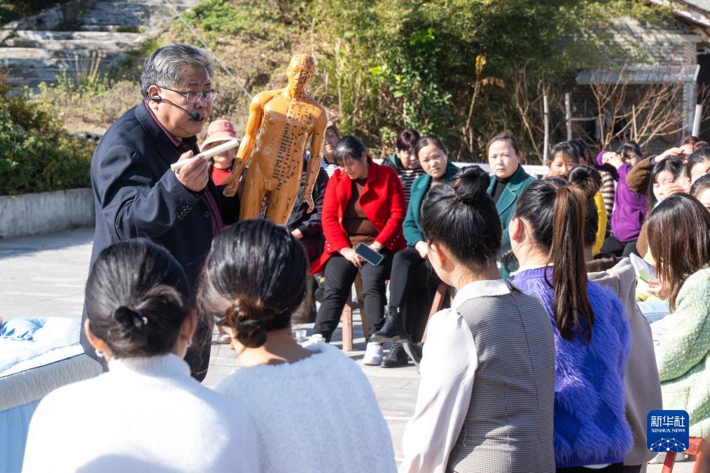 12月7日,在蕲春县青石镇大屋村,中医艾灸师为村民讲授艾灸技法。