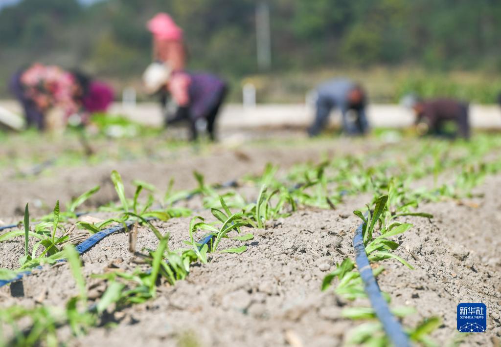 12月7日,在湖南省永州市道县梅花镇贵头村,农民在移栽莴笋苗。