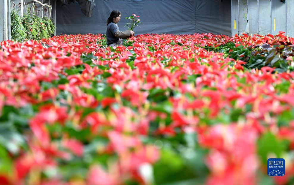 12月7日,河北省石家庄市新华区一家花木场的工人在管护花卉。