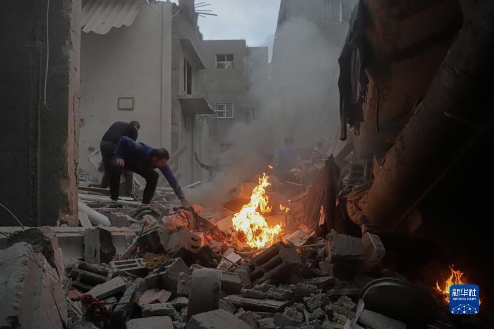 12月7日,在加沙地带南部城市汗尤尼斯,巴勒斯坦人查看遭以军袭击后的建筑废墟。
