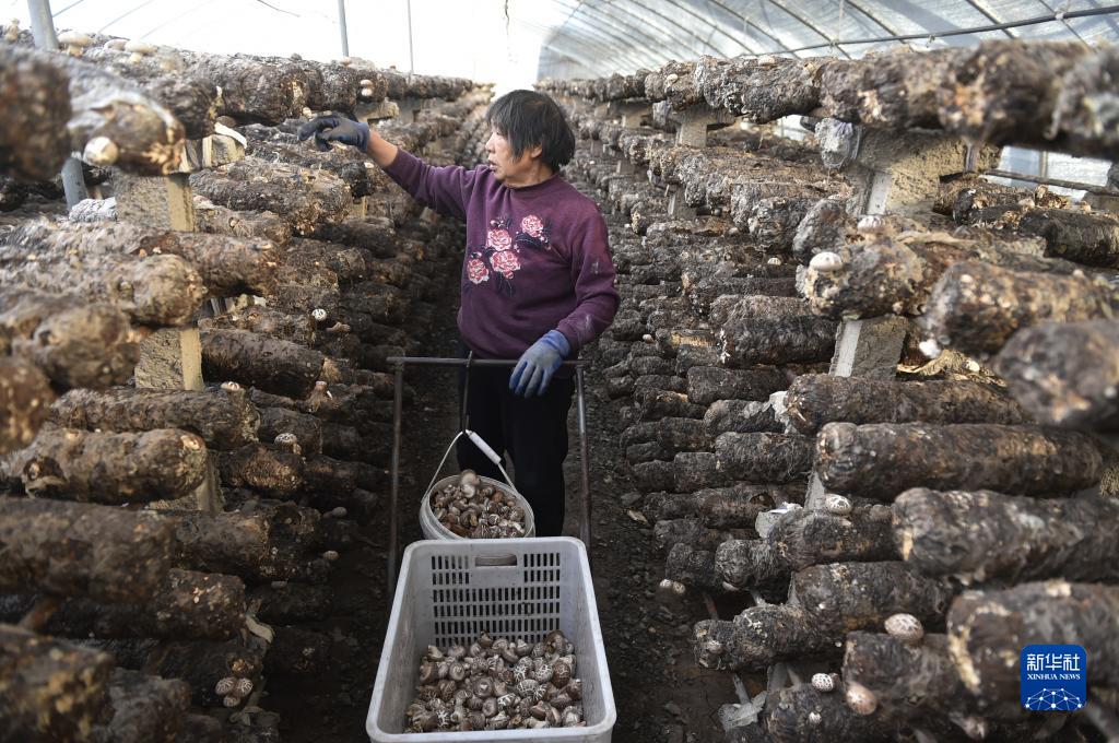 12月7日,朱寨村村民在种植大棚里采摘香菇。