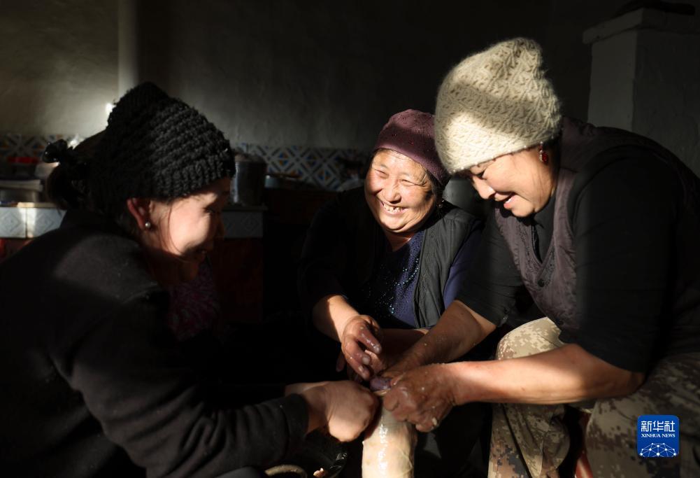 巴哈提(中)和亲友在屋内一边灌装牛肉肠,一边拉家常(11月30日摄)。
