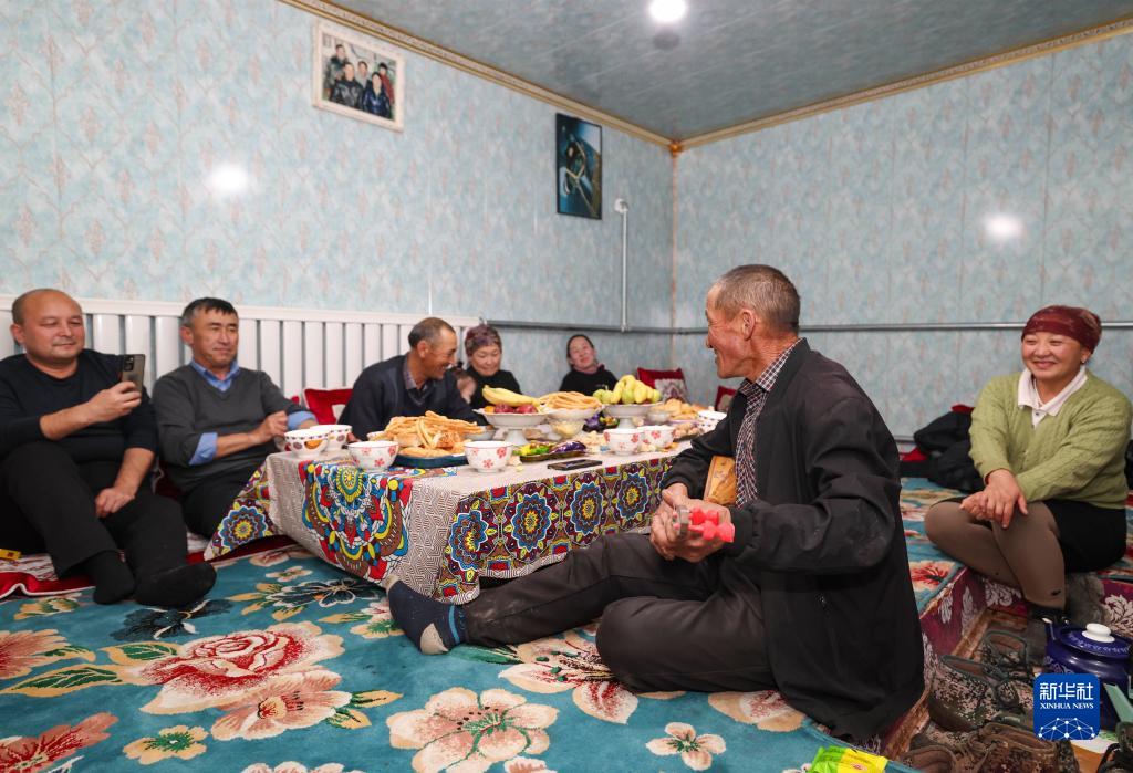 哈布得拉什么(中)自弹自唱,引得亲友笑声连连(11月30日摄)。