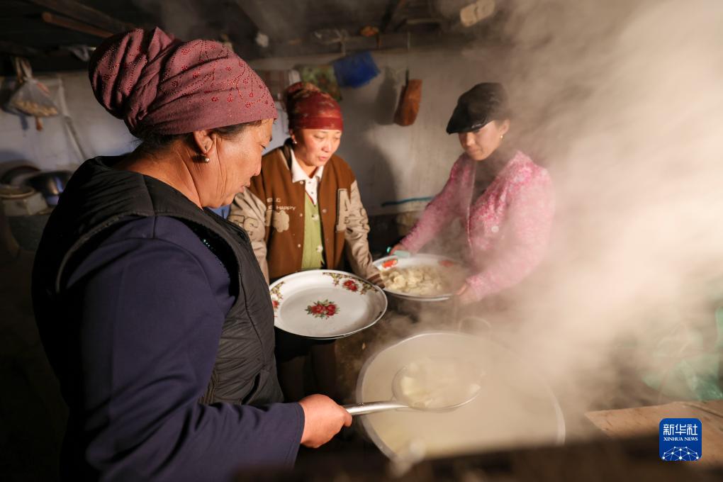 夜间,巴哈提(左)把煮好的面条捞出锅,弟媳(中)和大女儿在一旁等待,准备端给客人(11月30日摄)。