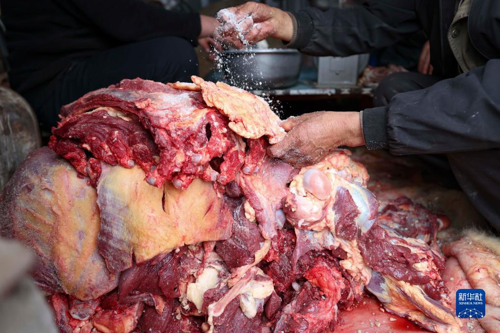 哈布得拉什么把盐和蒜瓣撒在分割后的牛肉上(12月1日摄)。