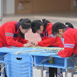 12月8日,梧州市长洲区大桥小学的学生在课堂上编织手工艺品。