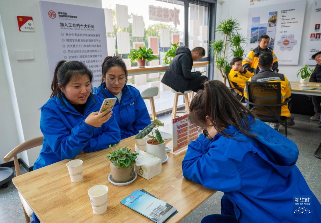 12月7日,在浙江省杭州市玲珑街道和谐劳动关系服务站,公司职工在服务站内休息。