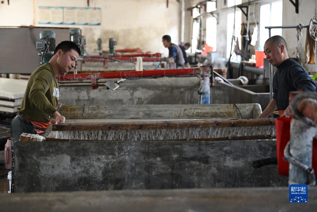 在位于泾县的中国宣纸股份有限公司里,“90后”工人已成长为独当一面的巧匠。捞纸工管家明负责“掌帘”,和同伴相互配合,将竹帘放入纸浆槽,左抄右抄一捞一提,通过手感就能把纸张的重量、厚薄、均匀度控制在最小误差;在蒸腾的热气中,晒纸工吴帆指尖轻捻,将厚厚一叠湿润的纸张分离,在焙面上把纸张刷平整、烘干,动作一气呵成。他们说,宣纸制作工艺有着深厚的文化底蕴,自己还要在工作中不断精进技艺,希望将来也能够带徒弟,把手艺一代一代传承下去。
