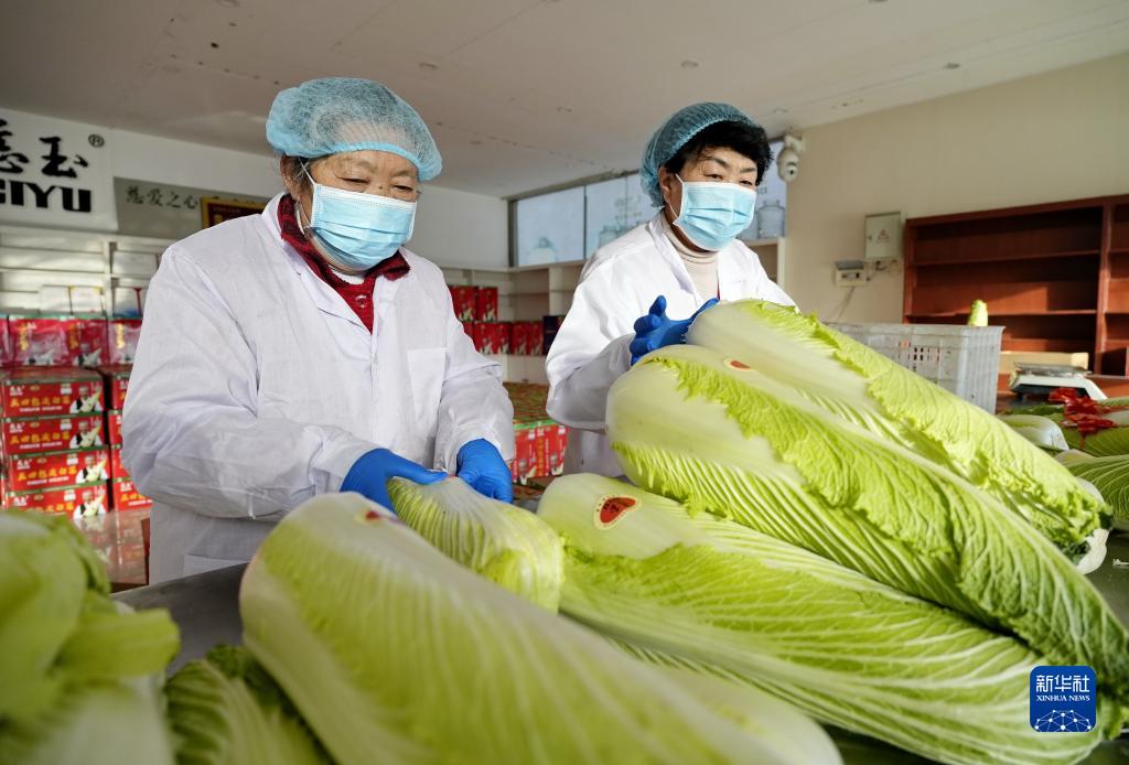 12月8日,河北省玉田县黑猫王农民专业合作社的员工在整理包尖白菜,准备包装。