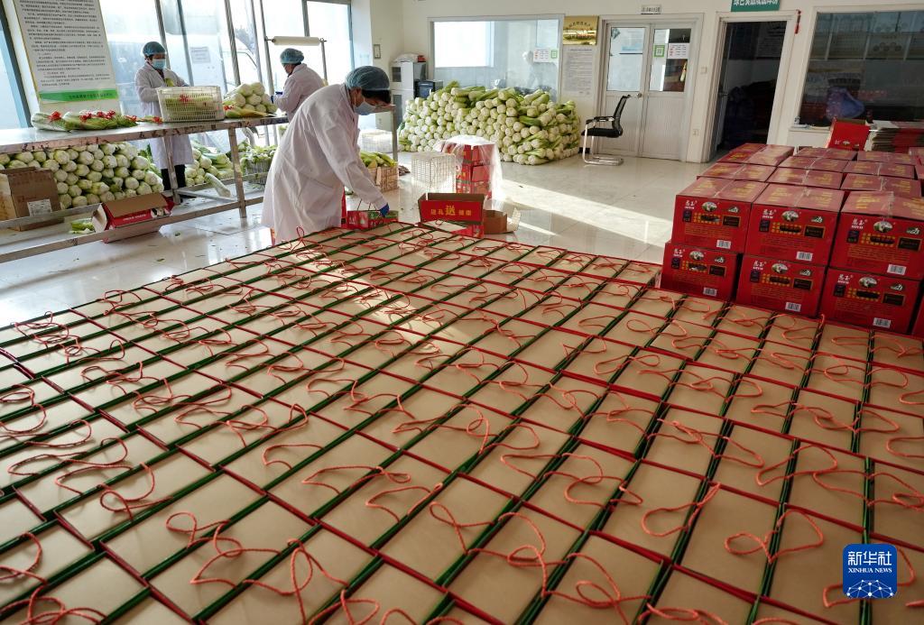 12月8日,河北省玉田县黑猫王农民专业合作社的员工在整理包尖白菜礼盒。