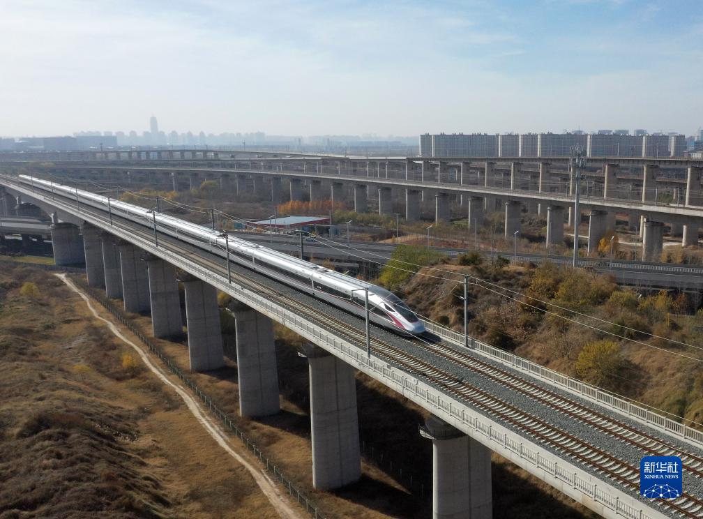 12月8日,在郑州市东三环附近,列车行驶在济郑高速铁路上(无人机照片)。