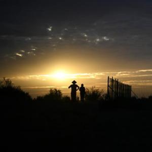 夕阳下,陈静和丈夫高万东在拍摄五墩烽火台附近的长城(8月17日摄)。