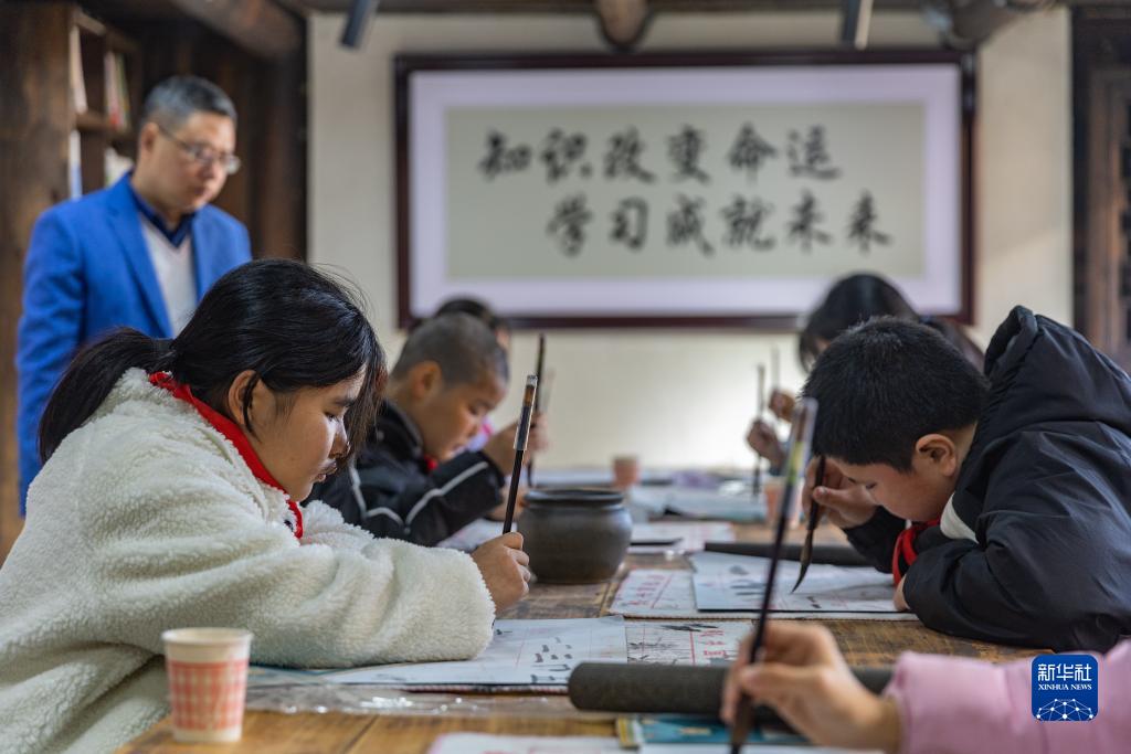 12月7日,在重庆市丰都县仁沙镇陶家坪村的“新丰书院”,孩子们在这里的“仁智学堂”练习毛笔字。