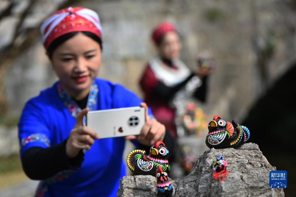 12月8日,在贵州省黔东南苗族侗族自治州黄平县飞云崖景区,一名游客在拍摄手工制作的泥哨。