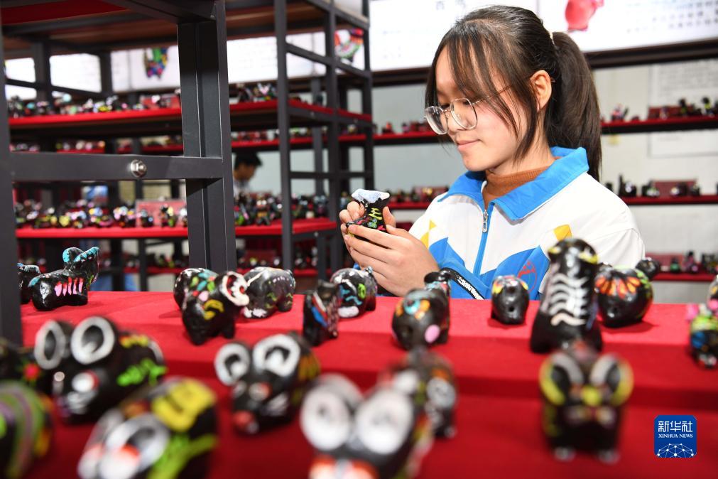 12月8日,学生在贵州省黔东南苗族侗族自治州黄平县旧州中学社团活动室摆放制作好的泥哨。