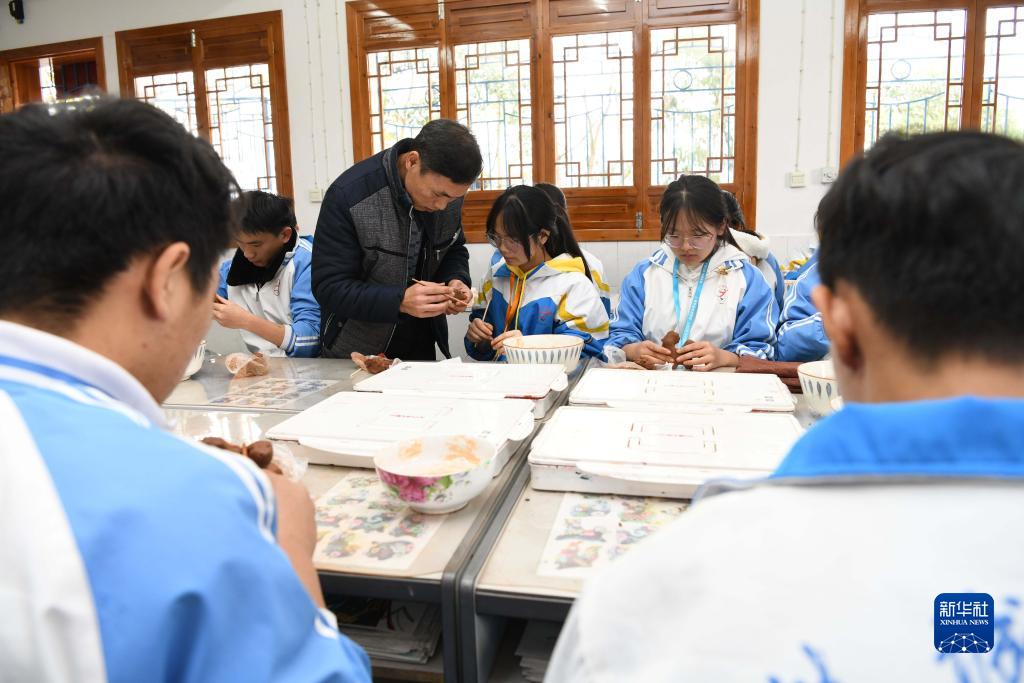12月8日,在贵州省黔东南苗族侗族自治州黄平县旧州中学社团活动室,非遗传承人潘文斌给学生讲解泥哨制作技艺。