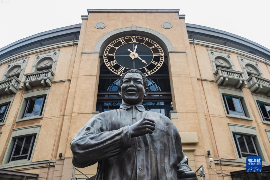 这是12月5日在南非约翰内斯堡曼德拉广场拍摄的一座曼德拉铜像。