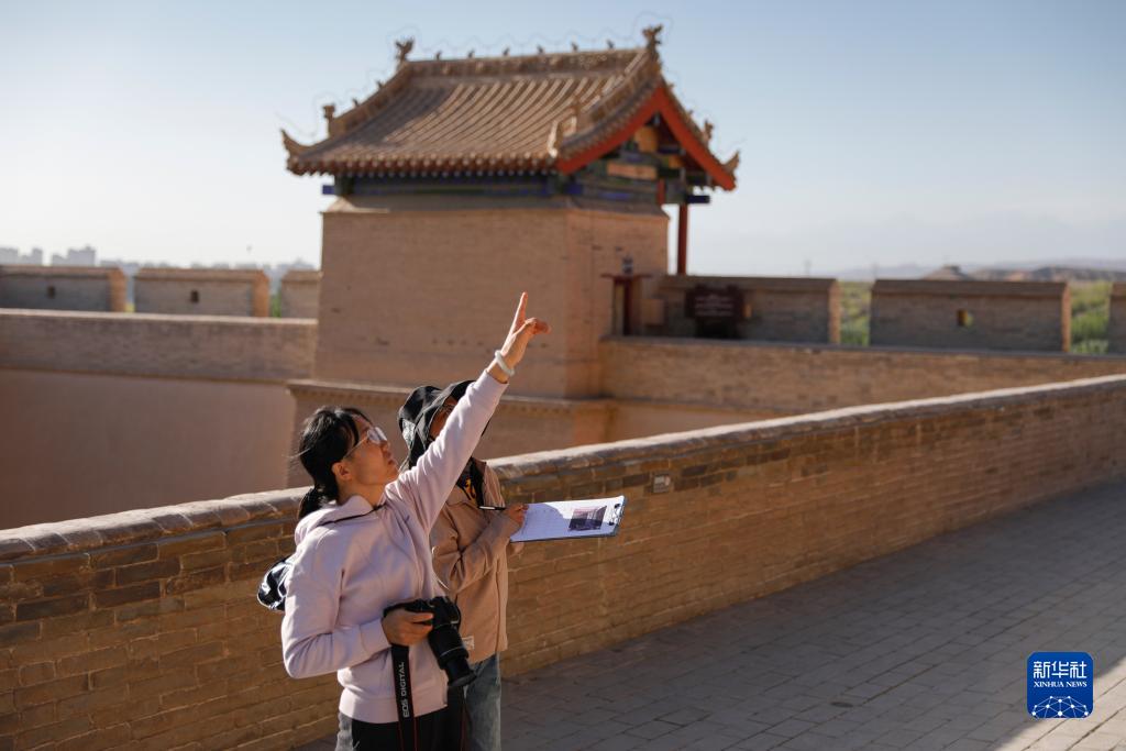 7月14日,嘉峪关丝路(长城)文化研究院文化遗产监测中心副研究馆员柳君君(左)和同事在甘肃嘉峪关关城景区巡查。