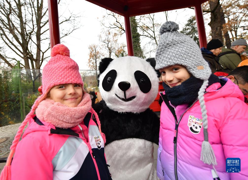 12月8日,在德国柏林动物园,小朋友和大熊猫人偶合影。