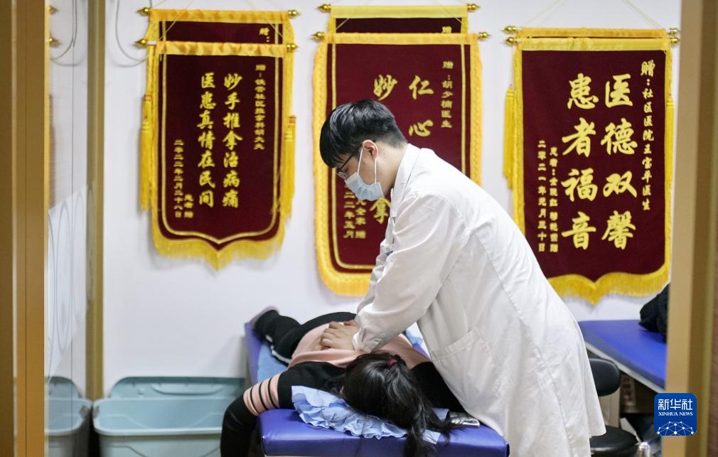 居民在丰台区成寿寺街道社区卫生服务中心举办的“中医药文化科普活动”上体验中医推拿按摩(12月8日摄)。