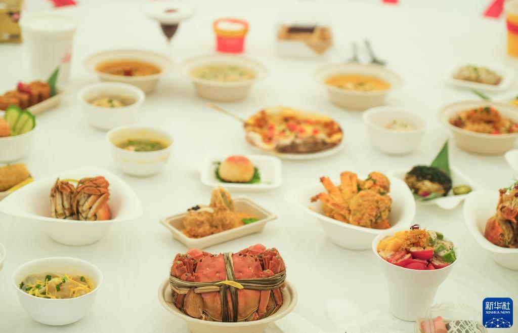 这是湖州市吴兴高新区杨溇村太湖吃蟹节上的各类以蟹为主题的特色美食(12月9日摄)。