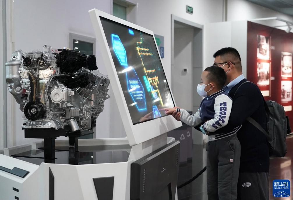 12月9日,家长和小朋友在北京汽车博物馆了解发动机构造。
