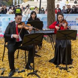 当日,一年一度的“银杏音乐会”在上海音乐厅南广场举行。在银杏树下,上海创·室内乐团青年音乐家们演奏多首四重奏经典佳作,上海芭蕾舞团青年演员跳起冬日华尔兹,为市民带来艺术盛宴。