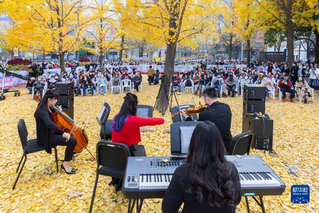 当日,一年一度的“银杏音乐会”在上海音乐厅南广场举行。在银杏树下,上海创·室内乐团青年音乐家们演奏多首四重奏经典佳作,上海芭蕾舞团青年演员跳起冬日华尔兹,为市民带来艺术盛宴。