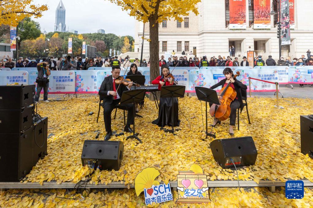 当日,一年一度的“银杏音乐会”在上海音乐厅南广场举行。在银杏树下,上海创·室内乐团青年音乐家们演奏多首四重奏经典佳作,上海芭蕾舞团青年演员跳起冬日华尔兹,为市民带来艺术盛宴。