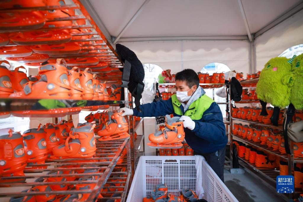 12月9日,工作人员在天津意式风情区马可波罗广场露天冰场整理滑冰装备。
