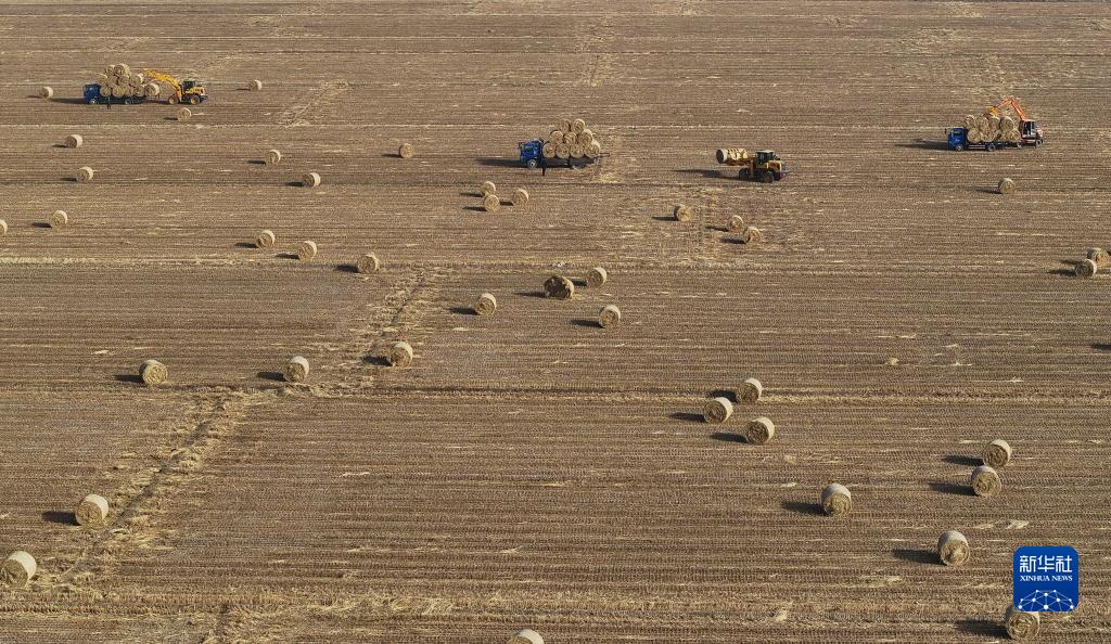 12月10日,在唐山市曹妃甸区第八农场田间,稻草回收企业的工人将打好捆的稻草装车(无人机照片)。