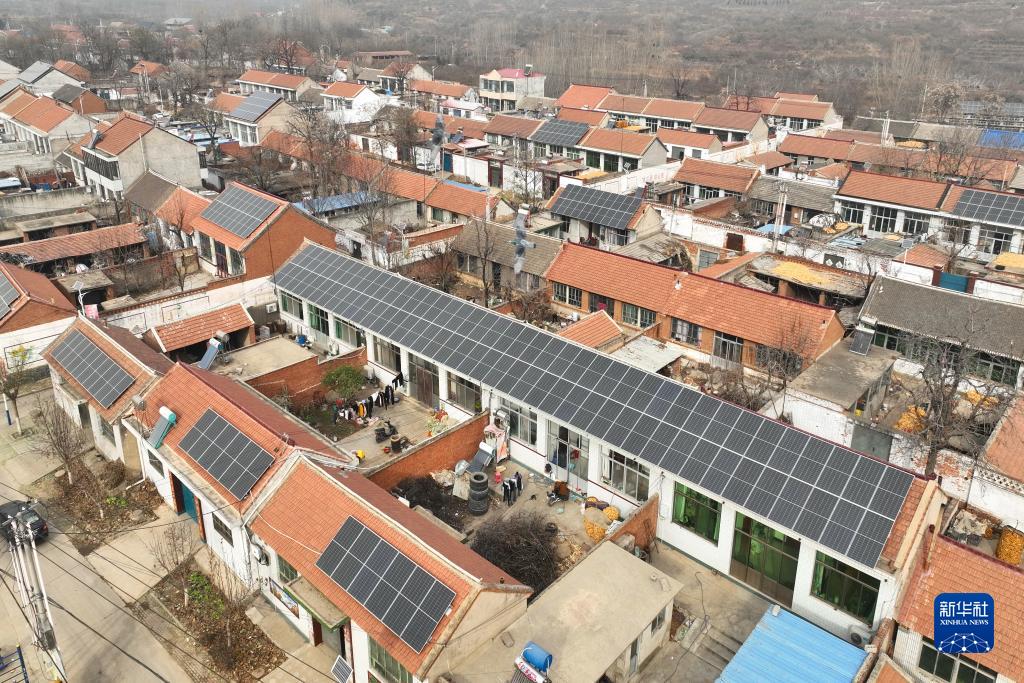 河北省玉田县郭家屯镇四角山村内的屋顶光伏发电设备(12月10日摄,无人机照片)。