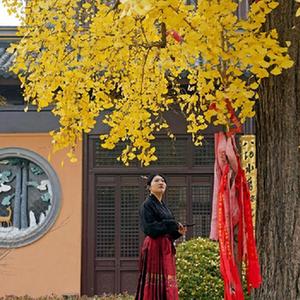 寒风乍起,银杏叶黄。在位于上海市青浦区练塘镇东厍村的庄严寺内,两棵古银杏树披上了金黄色的“盛装”,构成一幅美丽的冬景图。