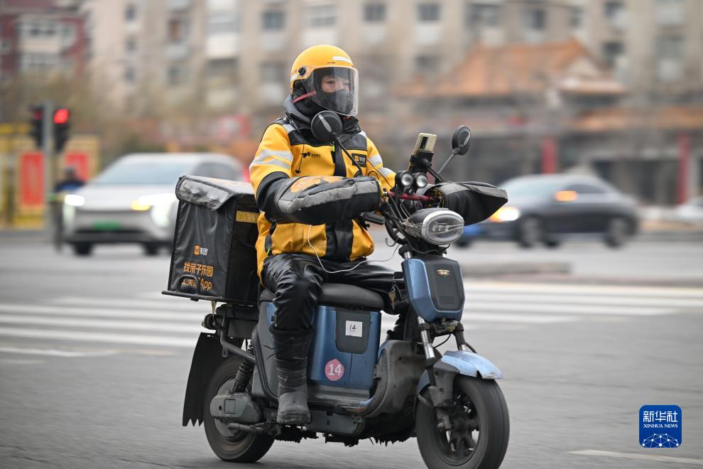 12月12日,在天津市南开区,外卖骑手身着御寒装备在送餐途中。