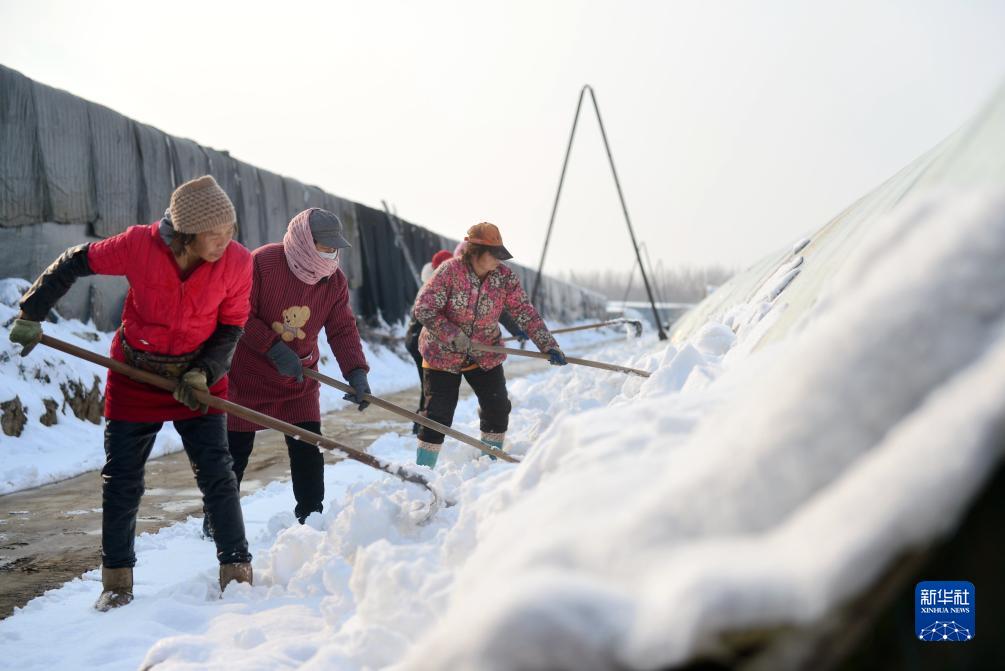 12月11日,在河北省石家庄市栾城区岗头村,种植户在清理大棚上的积雪。