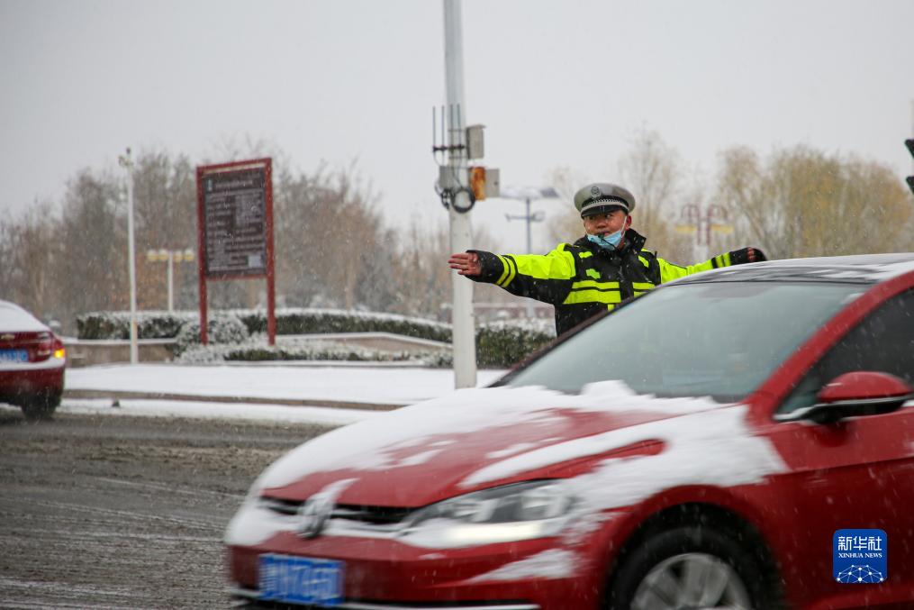 12月11日,在山东省滨州市沾化区,交警在雪中引导车辆有序通行。