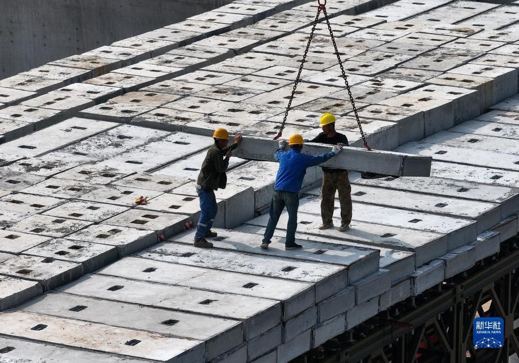12月12日,施工人员在深江铁路广中江特大桥南沙站桥段进行现浇梁支架预压块吊装作业(无人机照片)。