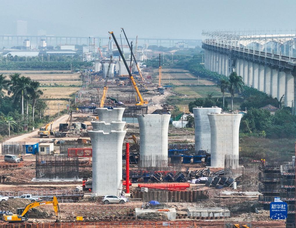 12月12日,施工人员在深江铁路广中江特大桥南沙站桥段作业(无人机照片)。