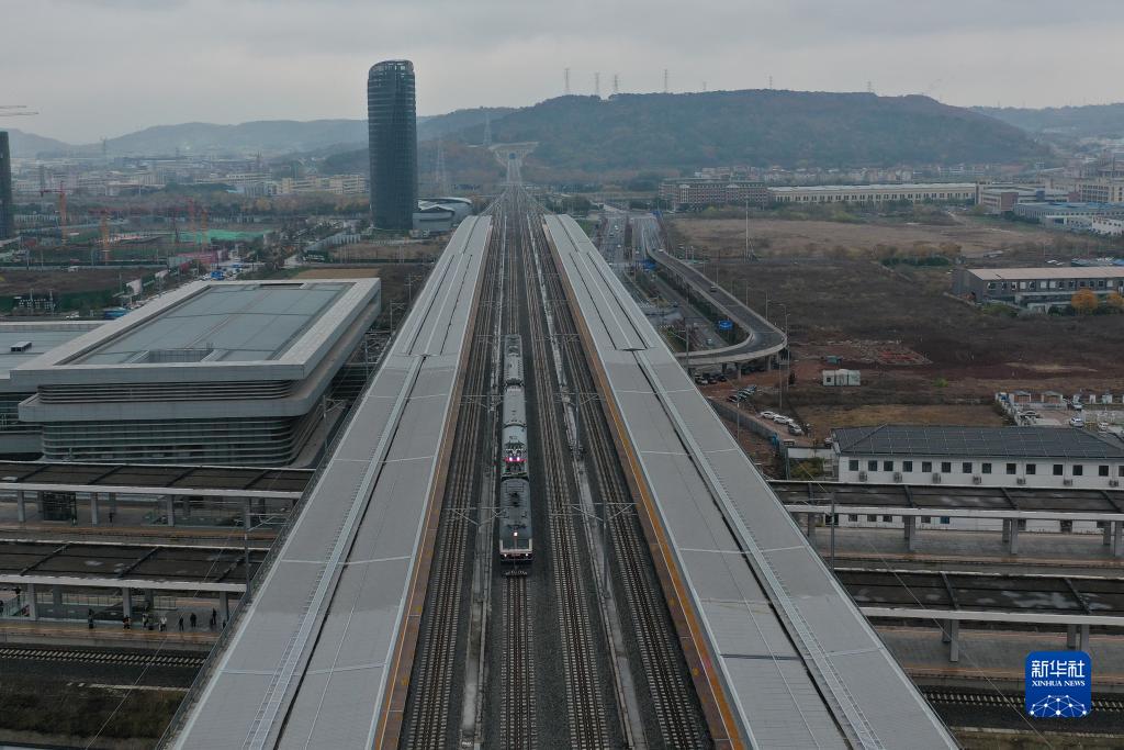 12月12日,动态检测列车行驶经过甬金铁路嵊州新昌站(无人机照片)。
