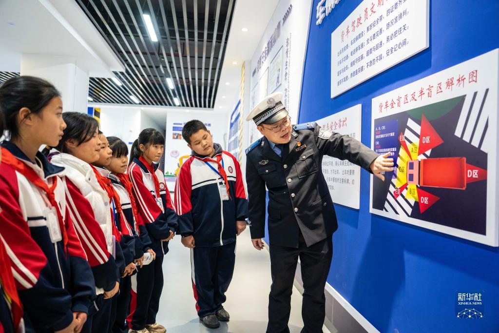 12月12日,在浏阳市交通安全宣传教育实践基地,民警给学生讲解货车视野盲区。