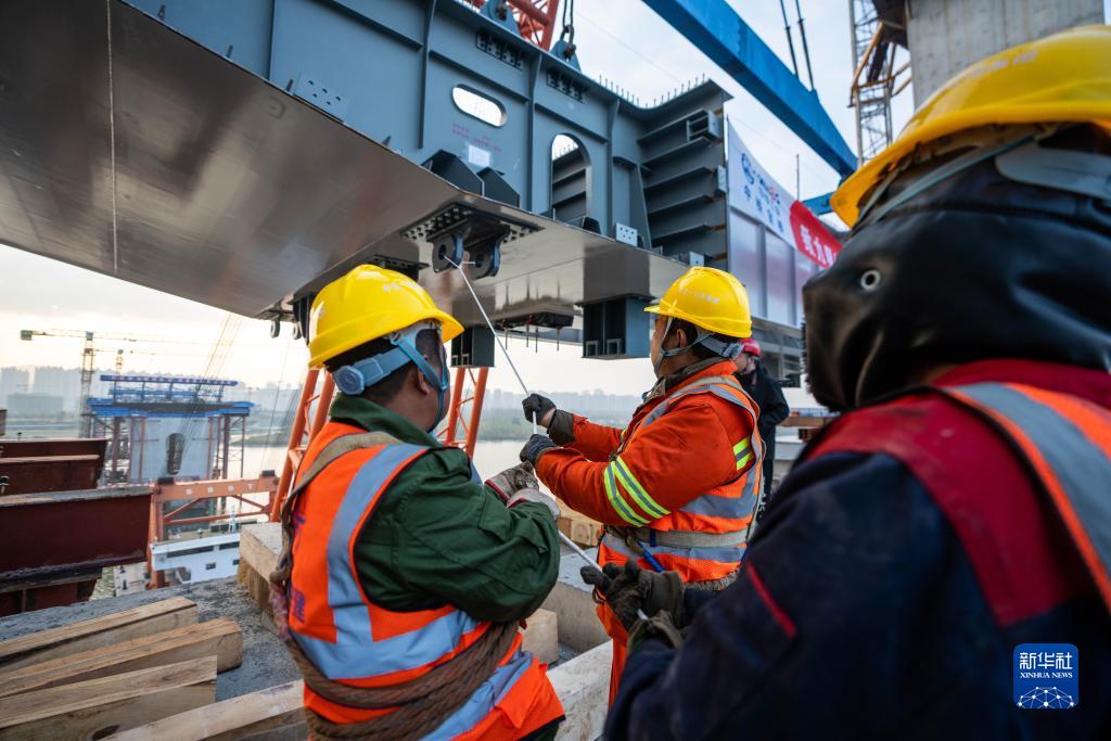 12月12日,在长沙兴联路大通道项目施工现场,工人在辅助主梁准确下降到指定位置。