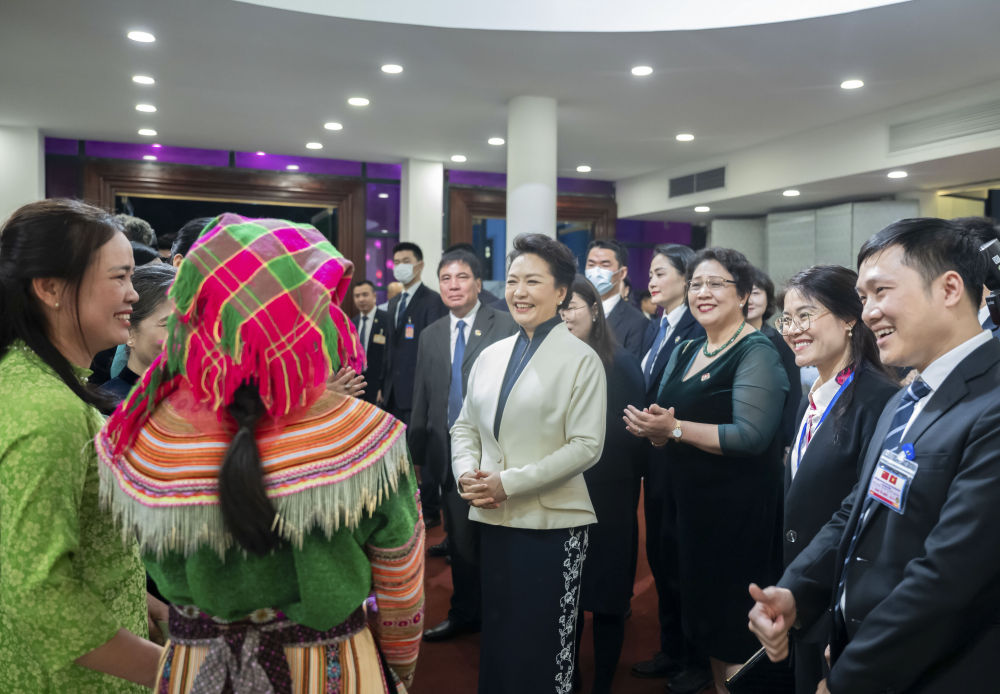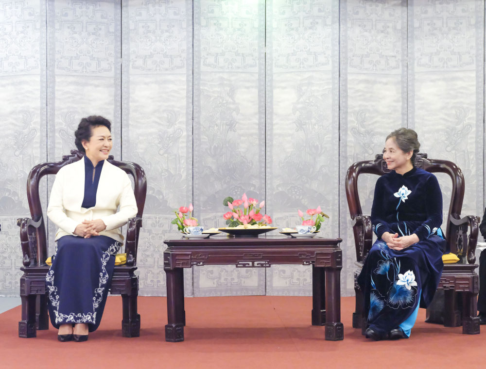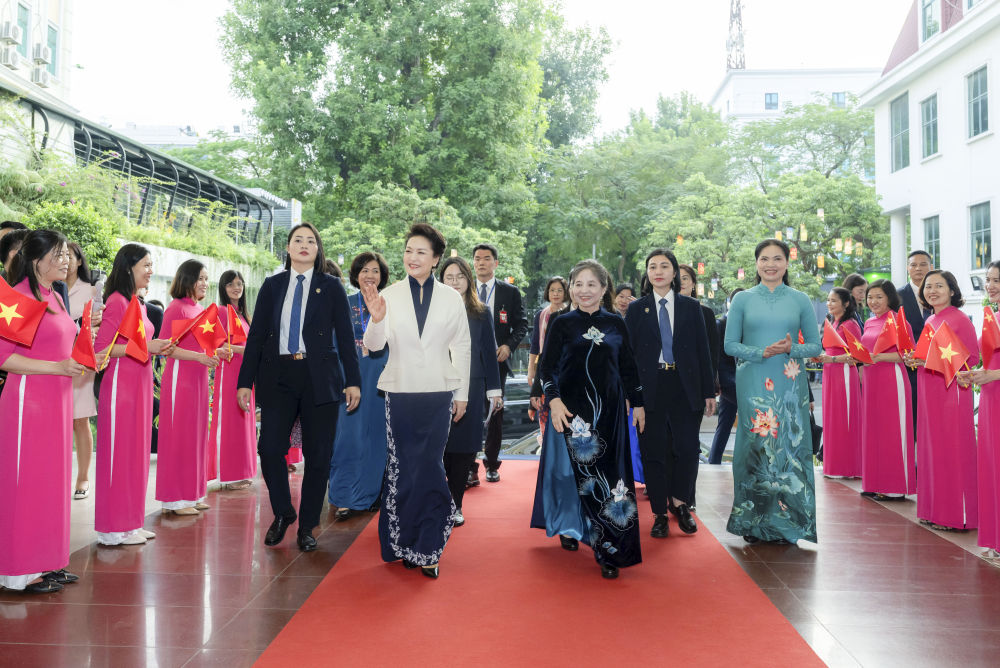 当地时间12月12日下午,中共中央总书记、国家主席习近平夫人彭丽媛在河内应邀同越共中央总书记阮富仲夫人吴氏敏共同参观越南妇女博物馆并茶叙。