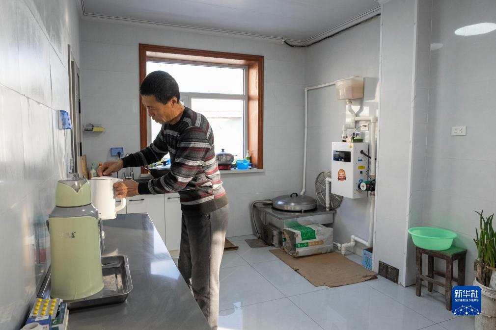 12月12日,在黑龙江省尚志市老街基乡基丰村,村民刘环茂在新建成的房屋里做家务。