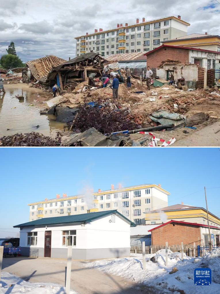 拼版照片:上图为在黑龙江省尚志市老街基乡基丰村,村民刘环茂家的房屋被洪水冲垮(8月5日摄)。新华社发(任春艳 摄);下图为12月12日,在黑龙江省尚志市老街基乡基丰村,村民刘环茂家的房屋已新建完成。新华社记者 谢剑飞 摄