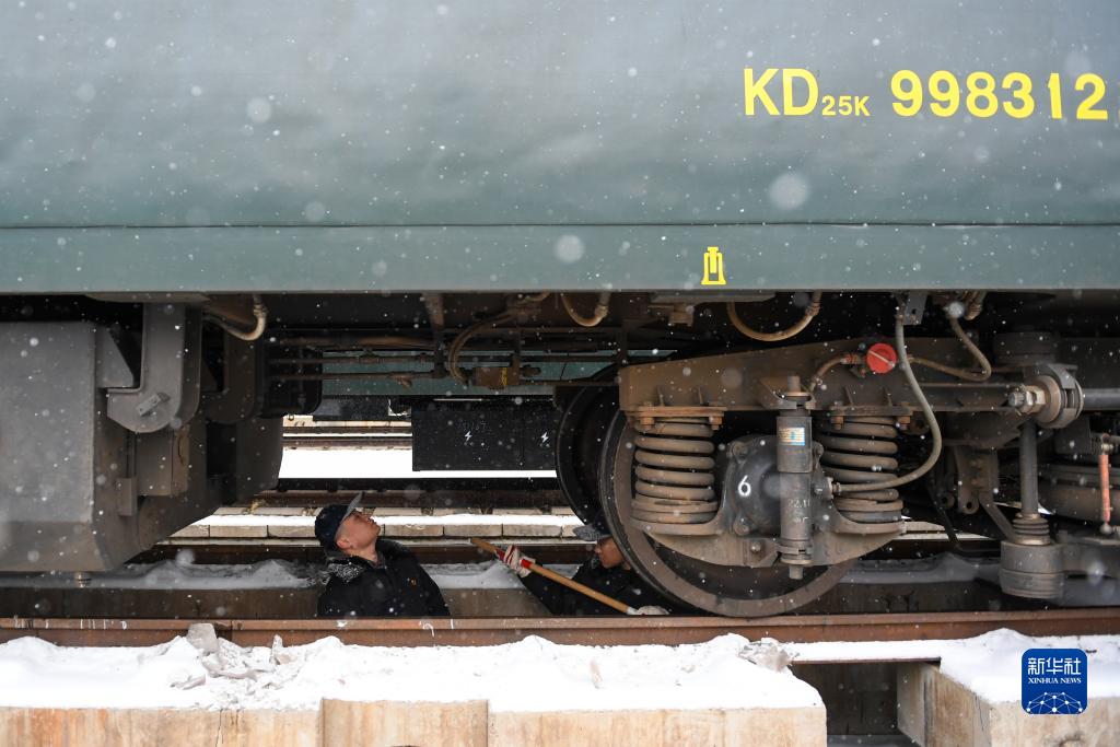 12月13日,在中国铁路北京局集团有限公司北京车辆段,检修人员在冒雪检修入库列车。