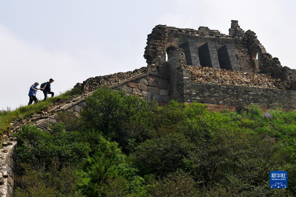 严共明(右)拉着严欣强行走在北京延庆的长城花家窑子段(9月5日摄)。