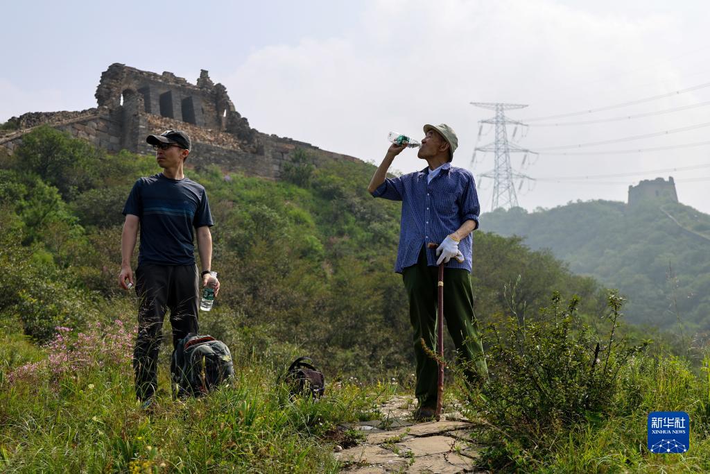 严欣强(右)和严共明在北京延庆的长城花家窑子段考察途中喝水(9月5日摄)。