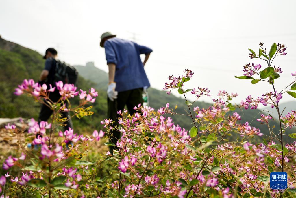 严欣强(右)和严共明在北京延庆的长城花家窑子段考察途中(9月5日摄)。