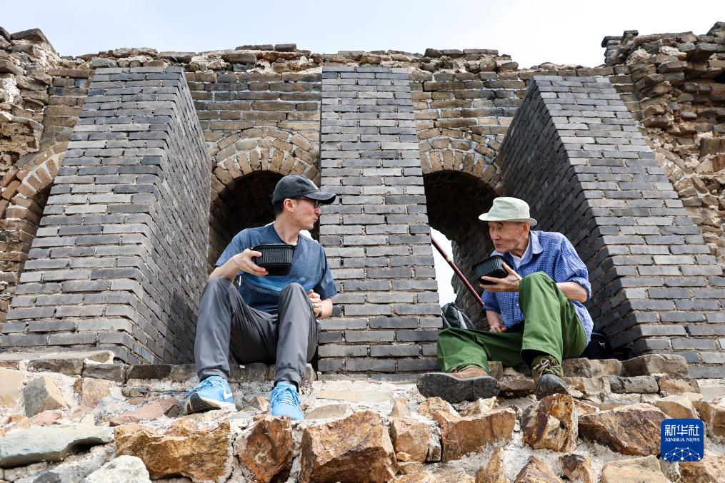 严欣强(右)和严共明在北京延庆的长城花家窑子段上吃午饭(9月5日摄)。